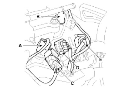 (5) Disconnect the ECTS (Engine coolant temperature sensor) connector (A) the exhaust CMPS (Camshaft position sensor) connector (B), the condenser connector (C), the CKPS (Crankshaft position sensor) connector (D) and the oxygen sensor connector (E).