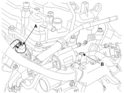 (6) Disconnect the intake CMPS (Camshaft position sensor) connector (A) and the PCSV (Purge control solenoid valve) connector (B).