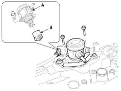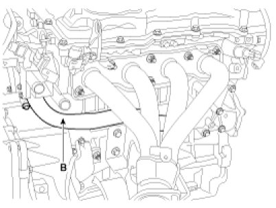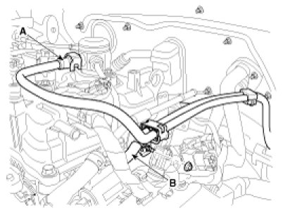 10. Disconnect the fuel hose (A) and PCSV (Purge control solenoid valve) hose (B).