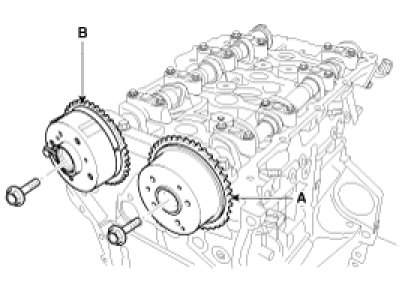 21. Remove the intake CVVT assembly (A) and exhaust CVVT assembly (B).