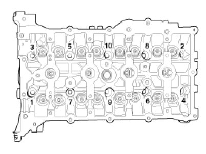 (1) Using triple square wrench, uniformly loosen and remove the 10 cylinder head bolts, in several passes, in the sequence shown. Remove the 10 cylinder head bolts and plate washers.