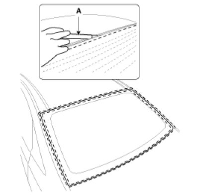 1. With a knife, scrape the old adhesive smooth to a thickness of about 2mm (0.08 in.) on the bonding surface around the entire rear window glass opening flange :