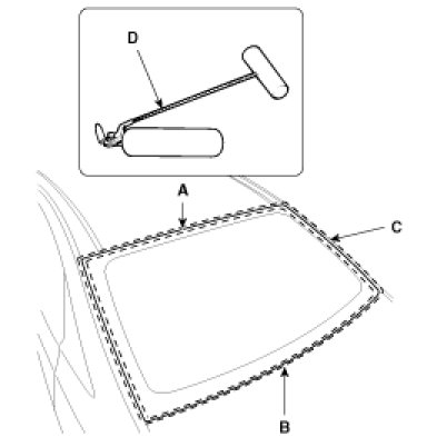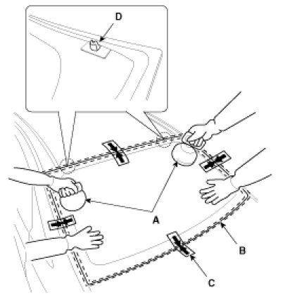 - When installing the rear window glass (B), set the rear glass service hole (D) to the frame exactly.