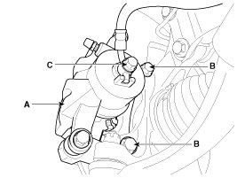 2. Loosen the hose eyebolt (C) and caliper mounting bolts (B), then remove the front caliper assembly (A).