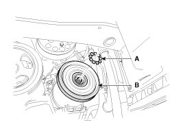 7. Disconnect the retainer ring (A) and then remove the pulley (B).