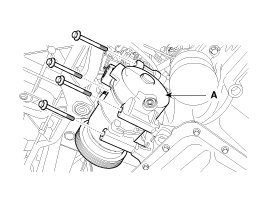 9. Disconnect the compressor clutch connector and then remove mounting bolts and the compressor (A).