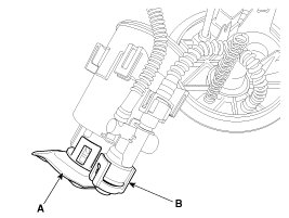 2. Disconnect the electric pump wiring connector (A) and the fuel sender connector (B).