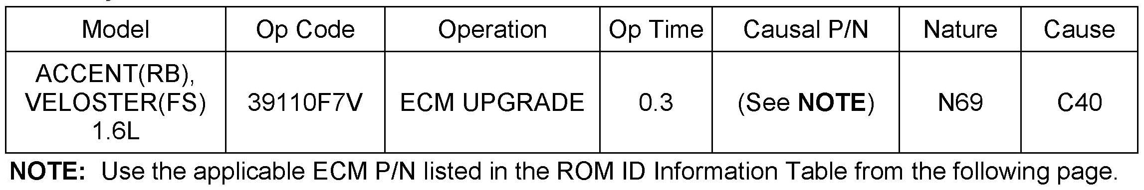Verify the ECM ROM ID before updating the vehicle's software. Refer to the table.
