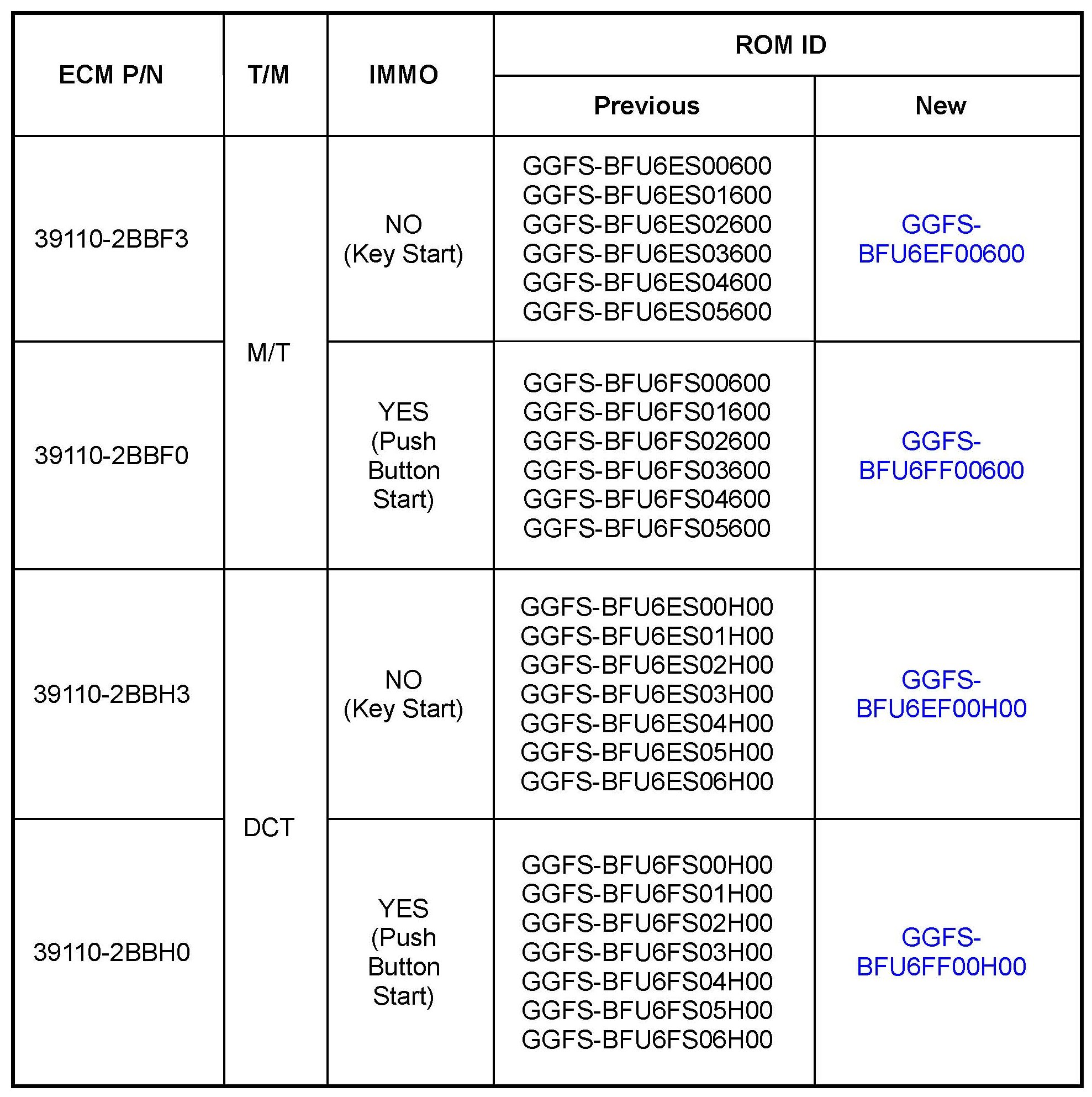 Verify the ECM ROM ID before updating the vehicle's software. Refer to the table.