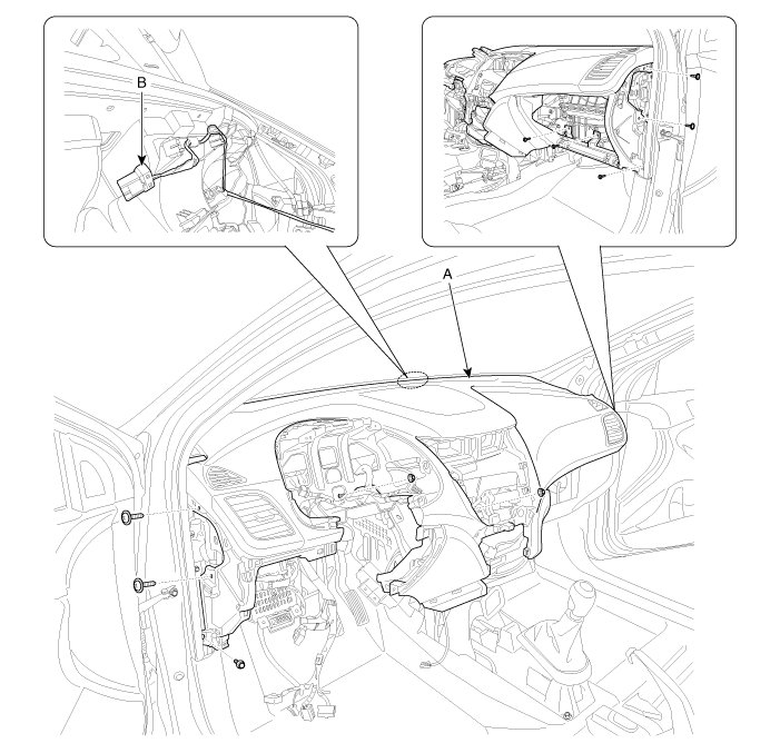 3. After loosening the mounting bolts and screws, then remove the crash pad lower panel (A).