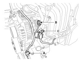 6. Disconnect the A/C compressor switch connector (A), the alternator connector (B) and the cable from the alternator "B" terminal (C).
