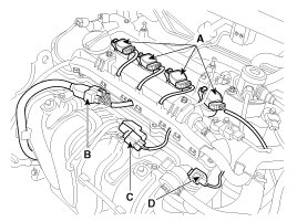 8. Disconnect the ignition coil connectors (A), the injector extension connector (B), the VIS (Variable intake system) connector (C) and the PCSV (Purge control solenoid valve) connector (D).