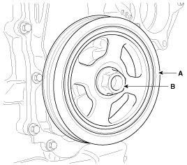 29. Remove the crankshaft bolt (B) and crankshaft pulley (A).