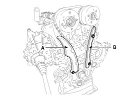 33. Remove the timing chain tensioner arm (A) and guide (B).