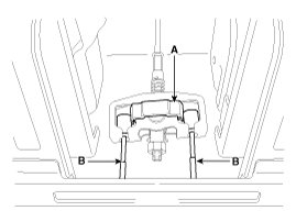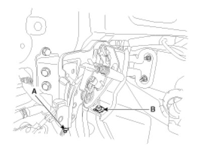 4. Remove the parking brake cable adjusting nut(A) and the fixing clip(B), and then remove the parking brake pedal.