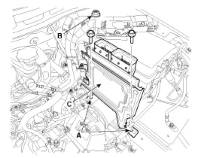 4. Remove the Transaxle Control Module(TCM) (C) after removing the mounting bolts (A) and nut (B).