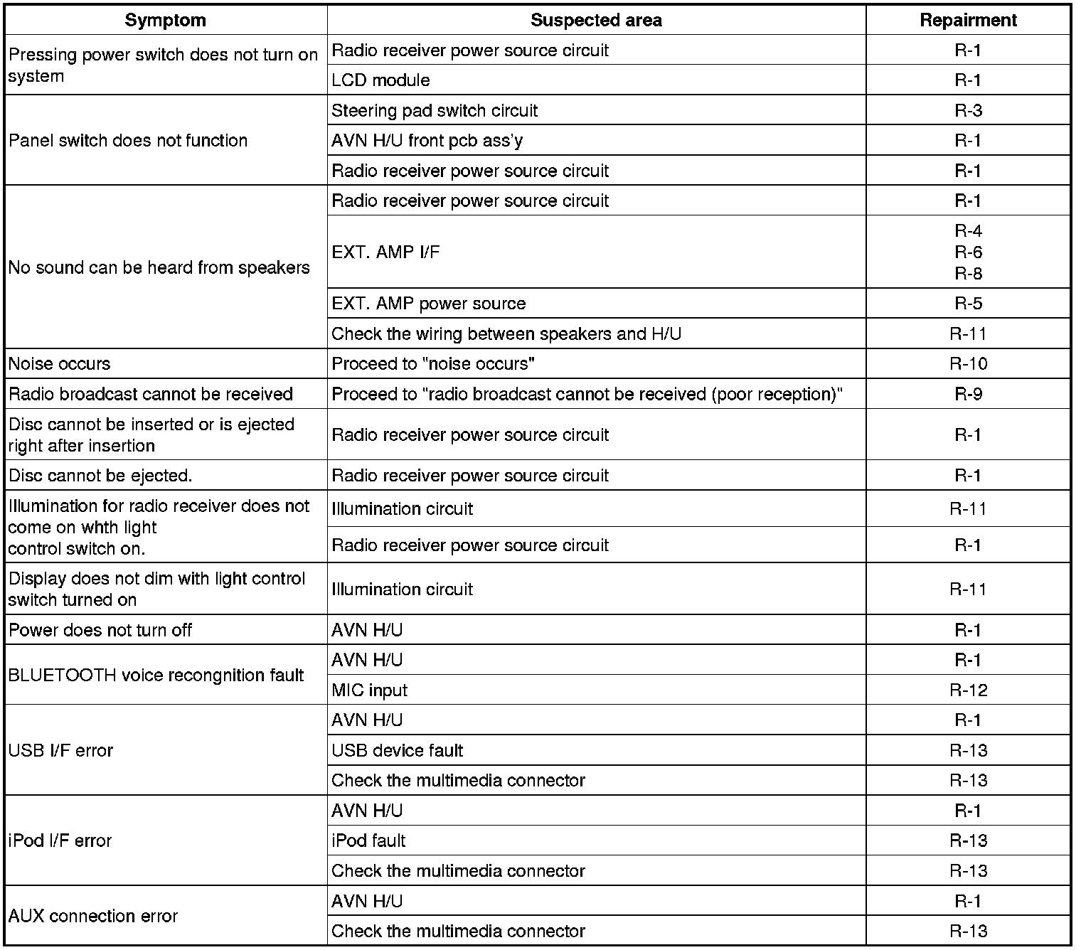 R-2 : Check the power connection of AVN head unit.