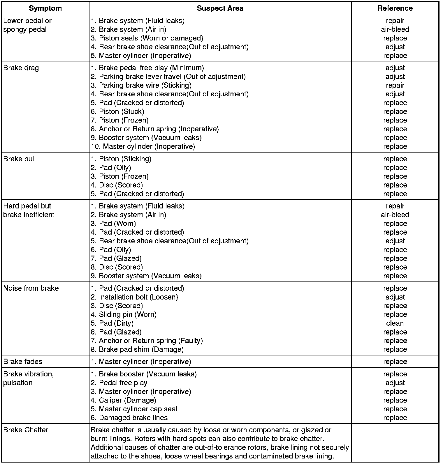 Problem Symptoms Table