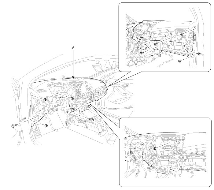 14. After loosening the mounting bolts and nuts, screw, then remove the main crash pad assembly (A).
