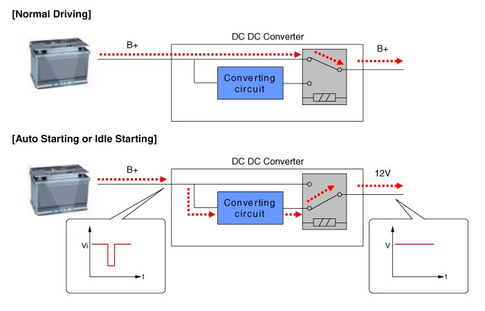 - In the ISG mode, if the power of an audio system turns OFF by drawdown while "Auto Starting" or "Idle Starting" function operates, replace the DC/DC converter.