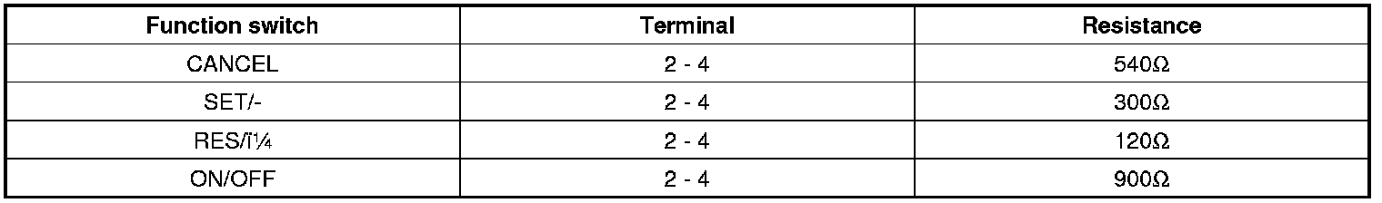 2. Measure resistance between terminals on the control switch when each function switch is ON (switch is depressed).