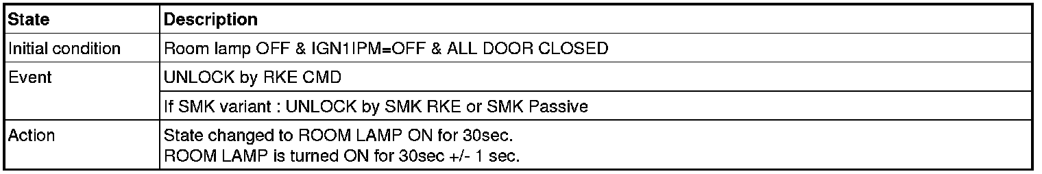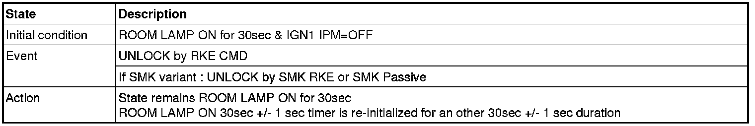Any door opens at terminal OFF state without FOB in. After transition to all door closed within 500msec, if the valid Fob is in side car and all door locked then IPM transmits SMK key reminder warning 2 command (SMK Warning