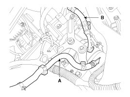6. Remove the mounting bolt, pressure hose (A), return hose (B).
