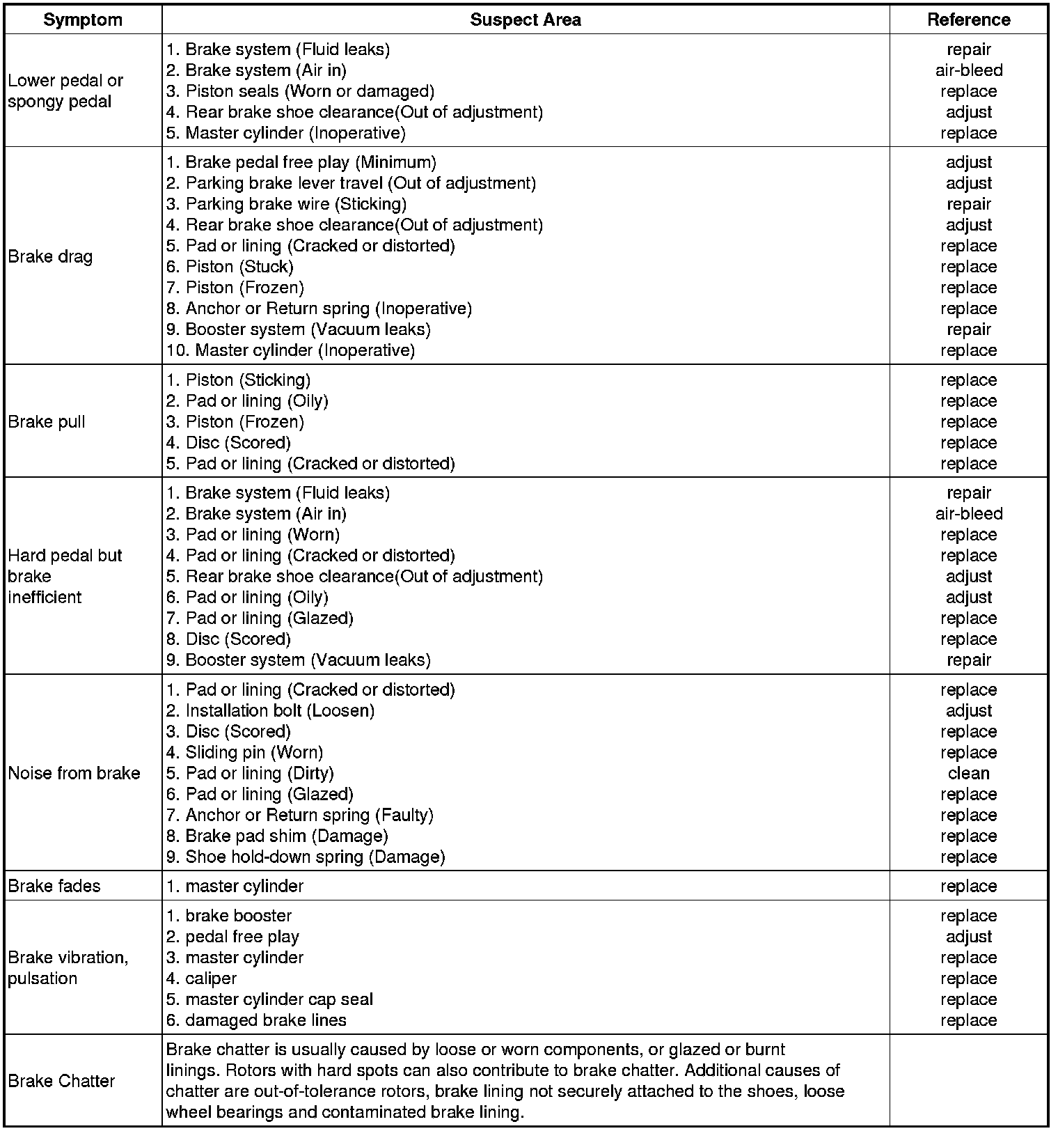 Problem Symptoms Table