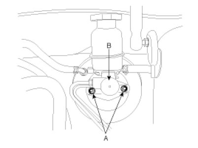 7. Remove the master cylinder (B) from the brake booster after loosening the mounting nuts (C).