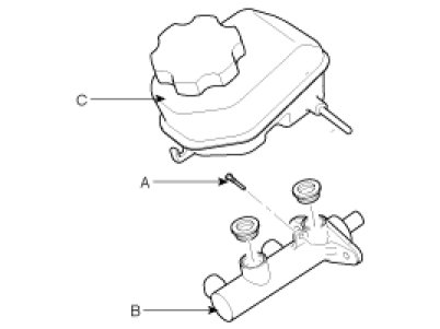 2. Remove the reservoir (C) from the master cylinder (B), after remove mounting screw (A).