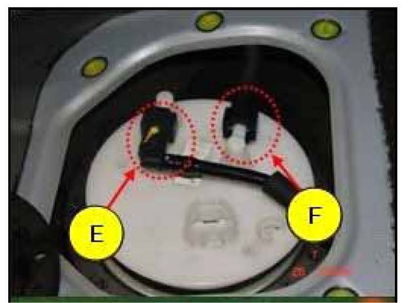 2. Release the lock tab and disconnect the fuel pump wiring connector (D).