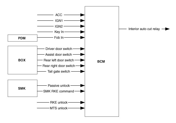 The "Tail Auto Cut" strategy ensures that Tail lamps are turned off even if a driver forgets to turn them off. When the Tail lamp is turned on by Tail lamp switch, after key insertion , and if a user removes key and opens the driver side door(or vice versa), the Tail lamps are automatically turned off. While "Tail Auto Cut" function is active, if a user turns off the Tail lamp switch or inserts key, "Tail Auto Cut" function will be deactivated and Tail lamps can be turned on.