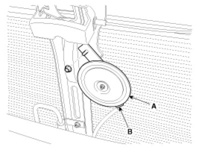 2. Remove the mounting nut and disconnect the horn connector (B), then remove the horn (A).