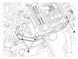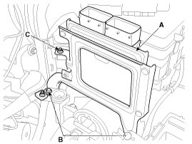 10. Remove the ECM bracket assembly (A) after removing the installation bolt (B) and nut (C).