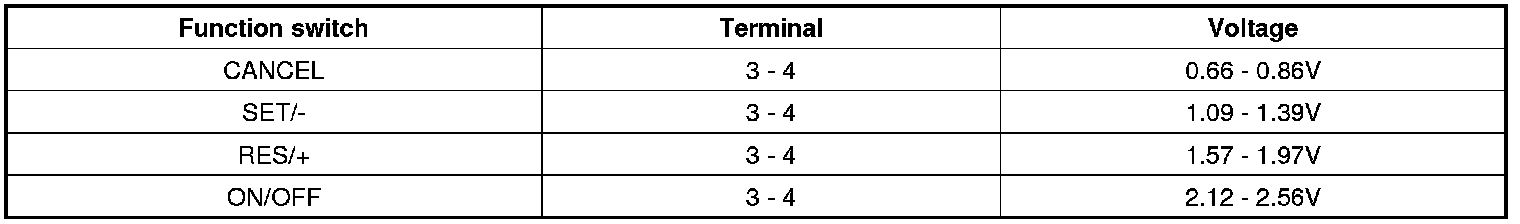 2. Measure voltage between terminals on the harness side connector when each function switch is ON (switch is depressed).