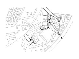 9. Disconnect the center speaker connector (A) and BCM unit connector (B).
