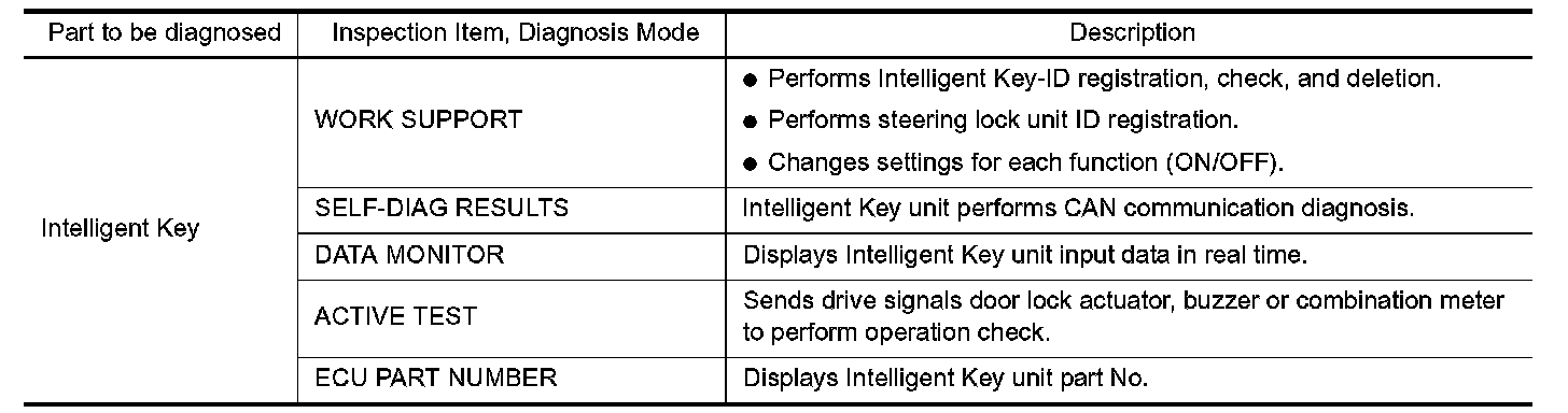 - CONSULT-II has display and inspection functions for work support, self-diagnosis, data monitor, and control unit part number by combining data reception and command transmission via communication lines from the Intelligent Key unit.
