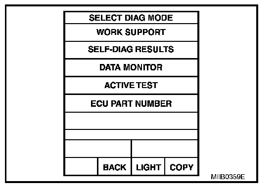 6. Select diagnosis mode. "WORK SUPPORT", "SELF-DIAG RESULTS", "DATA MONITOR", "ACTIVE TEST" and "ECU PART NUMBER" are available.