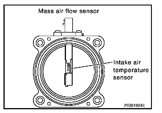 The mass air flow sensor is placed in the stream of intake air. It measures the intake flow rate by measuring a part of the entire intake flow. It consists of a hot film that is supplied with electric current from the ECM. The temperature of the hot film is controlled by the ECM a certain amount. The heat generated by the hot film is reduced as the intake air flows around it. The more air, the greater the heat loss. Therefore, the ECM must supply more electric current to maintain the temperature of the hot film as air flow increases. The ECM detects the air flow by means of this current change.