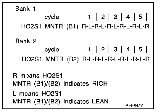 - "HO2S1 MNTR (B1)/(B2)" in "DATA MONITOR" mode changes from "RICH" to "LEAN" to "RICH" 5 times in 10 seconds.