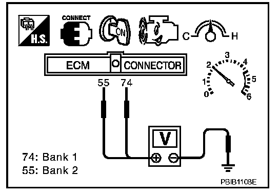 5. Set voltmeter probes between ECM terminal 74 [HO2S2 (B1) signal] or 55 [HO2S2 (B2) signal] and engine ground.