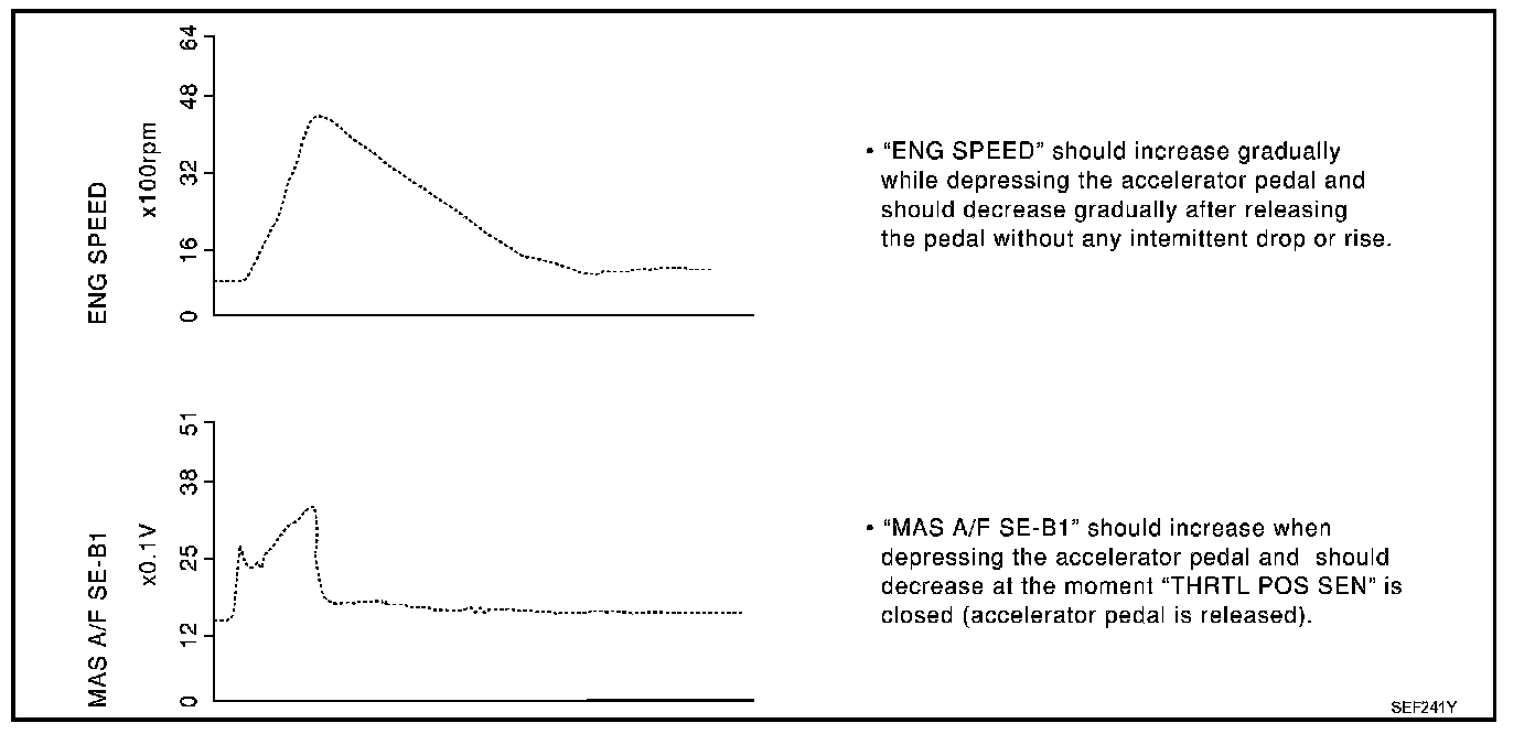 The signal of "ACCEL SEN1" and "THRTL SEN 1" should rise gradually without any intermittent drop or rise after "CLSD THLPOS" is changed from "ON" to "OFF".