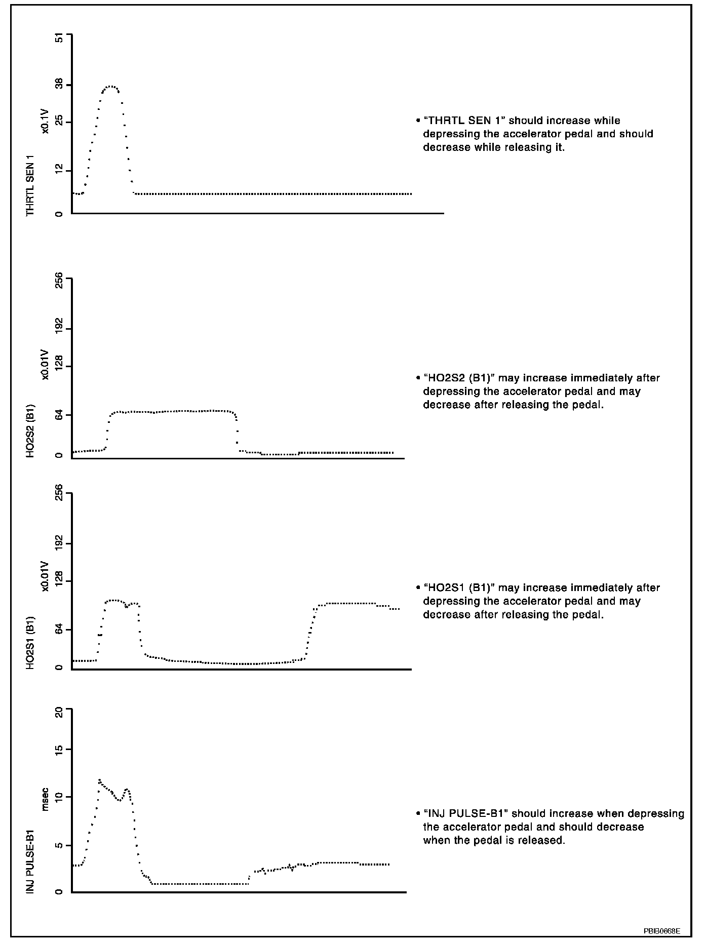 "HO2S2 (B1)", "HO2S1 (B1)" and "INJ PULSE-B1" when revving engine quickly up to 4,800 rpm under no load after warming up engine sufficiently.