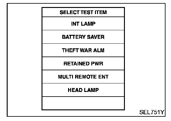 NOTE: Even though TRUNK OPENER is actually displayed on the CONSULT- II screen, it is not equipped, therefore, they cannot be activated.