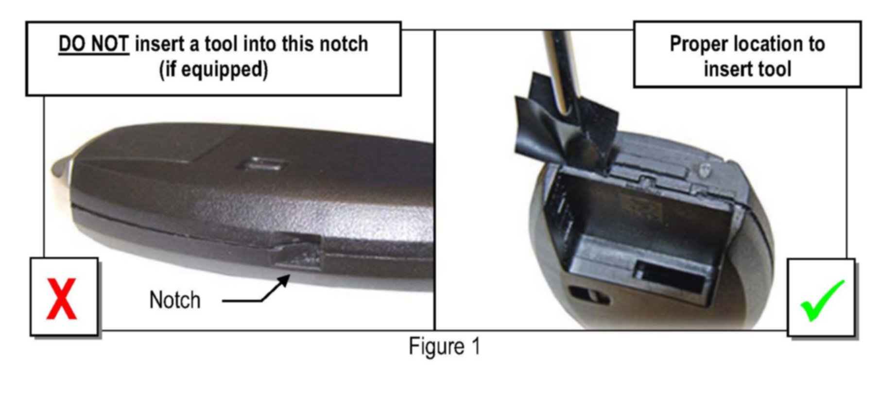 DO NOT insert a tool into the notches of the Intelligent Key (if equipped) to pry it open, as this may damage the printed circuit board (PCB).