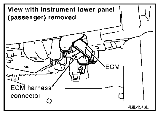 1. ECM is located behind the passenger side instrument lower panel. For this inspection, remove passenger side instrument lower panel.