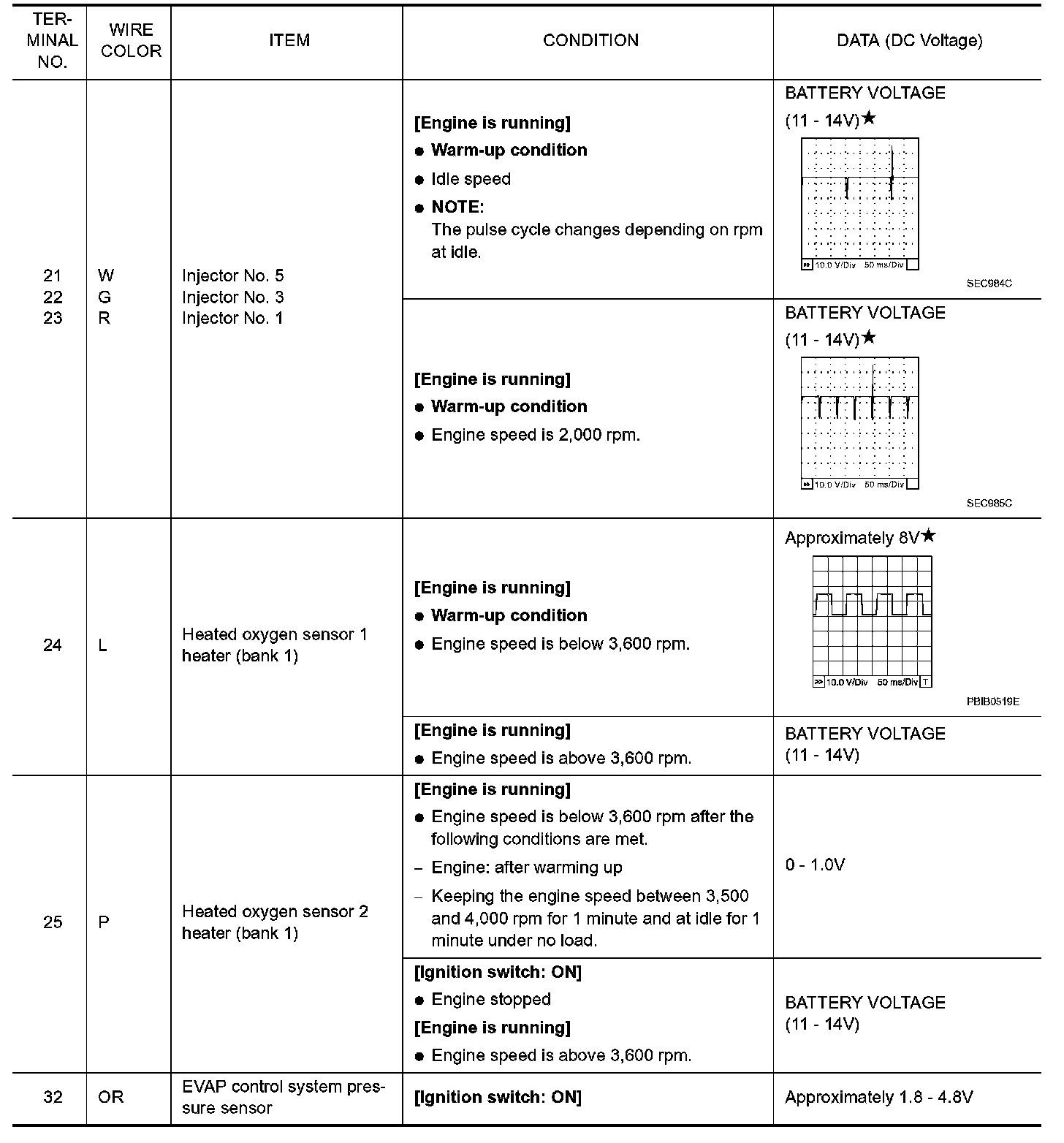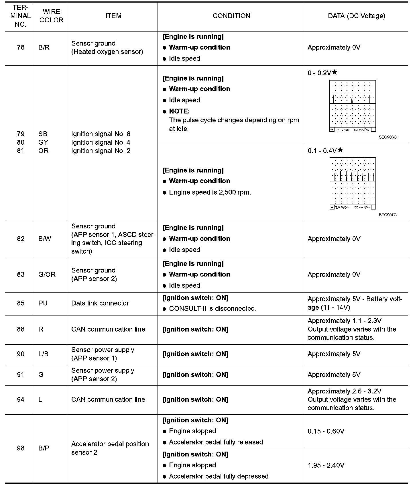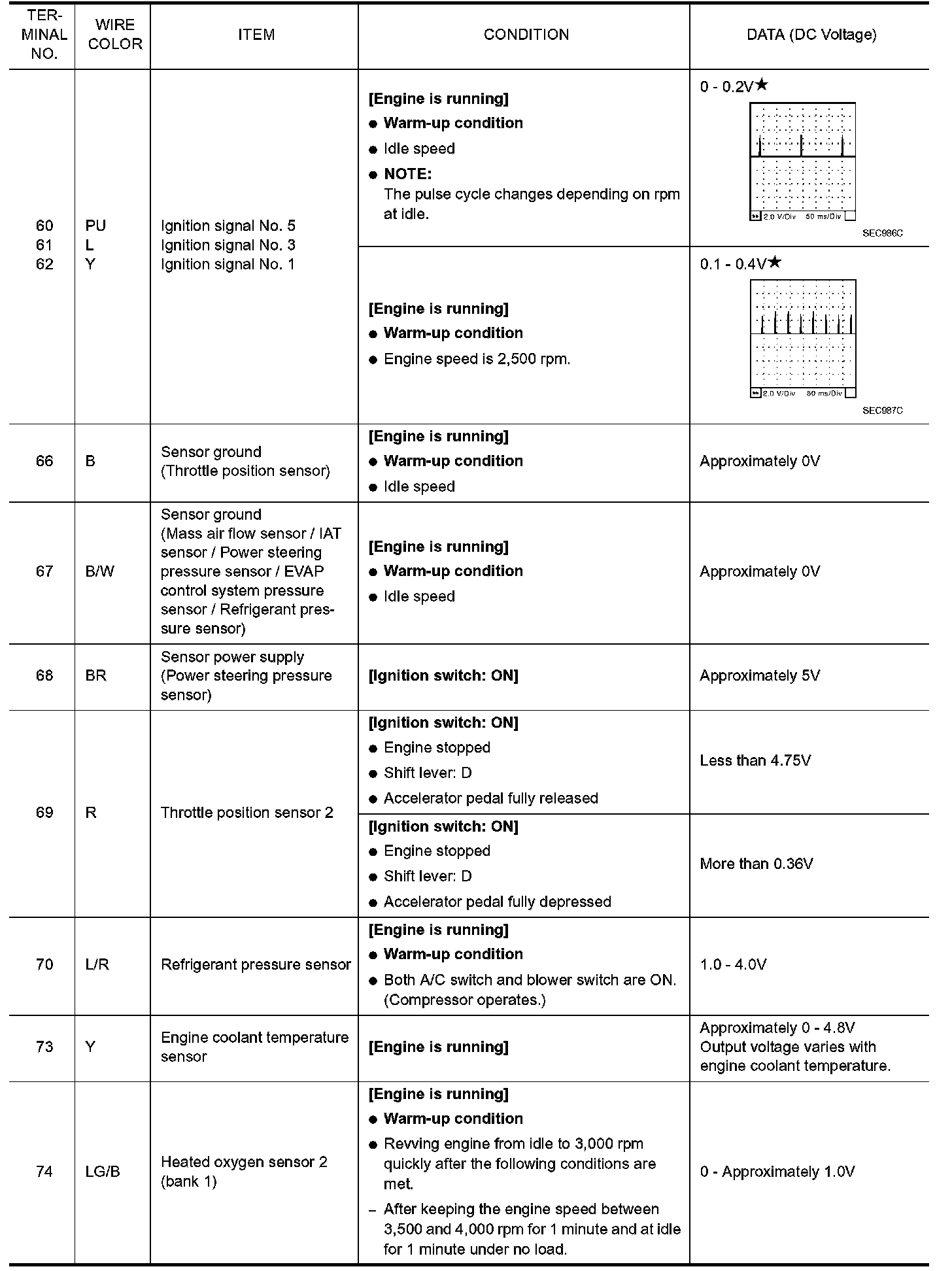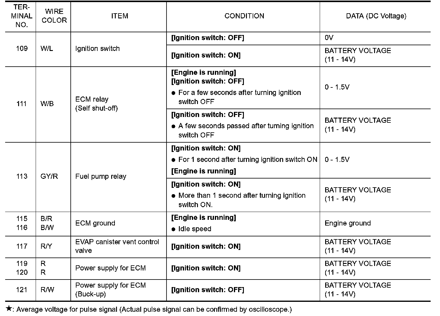 Specification data are reference values and are measured between each terminal and ground. Pulse signal is measured by CONSULT-II.