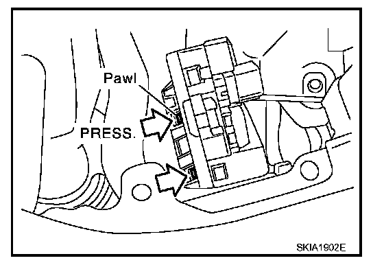 3. While pressing pawls on right and left side of IPDM E/R, remove IPDM E/R cover B from IPDM E/R.
