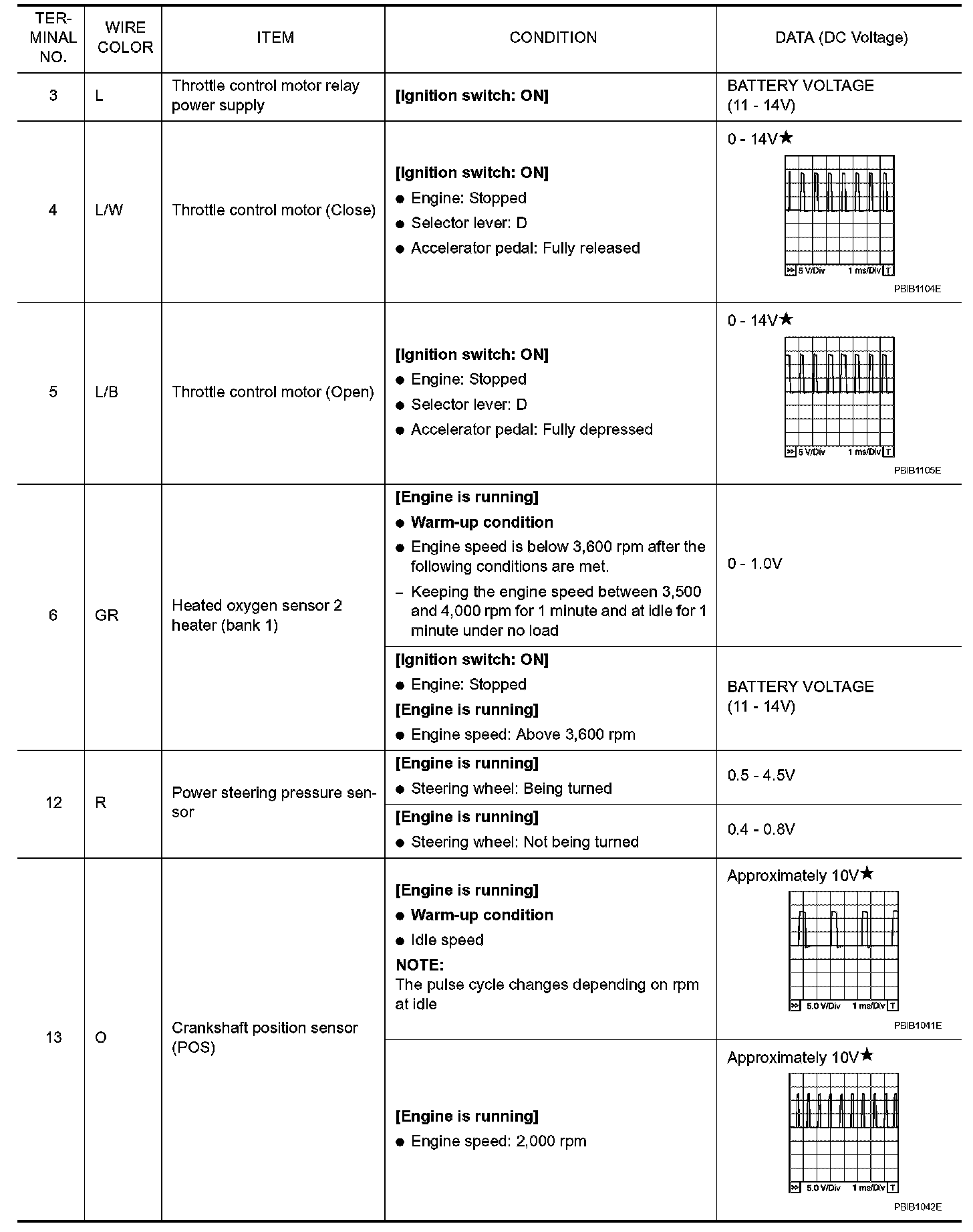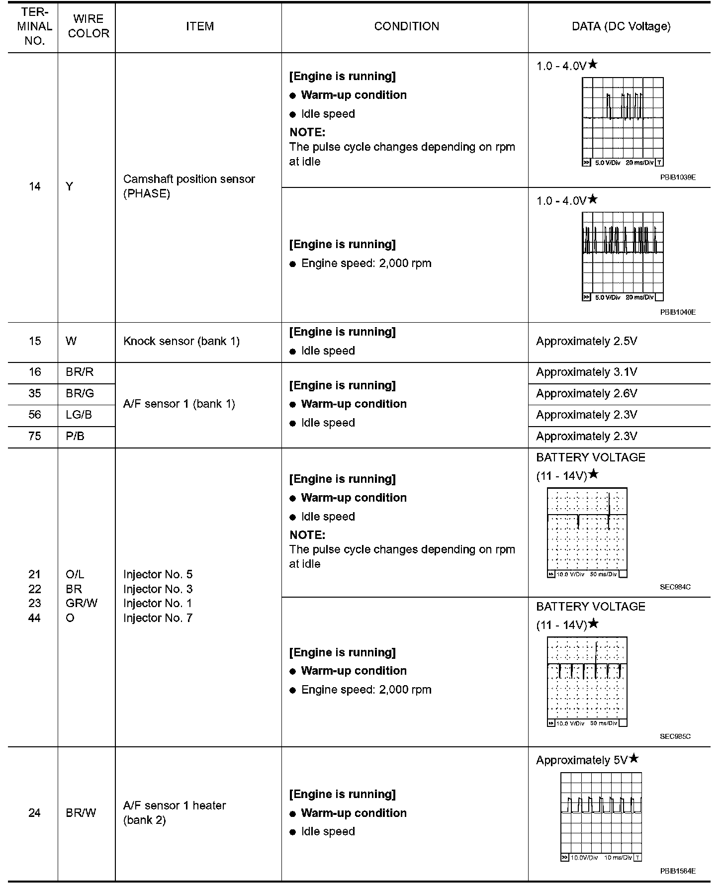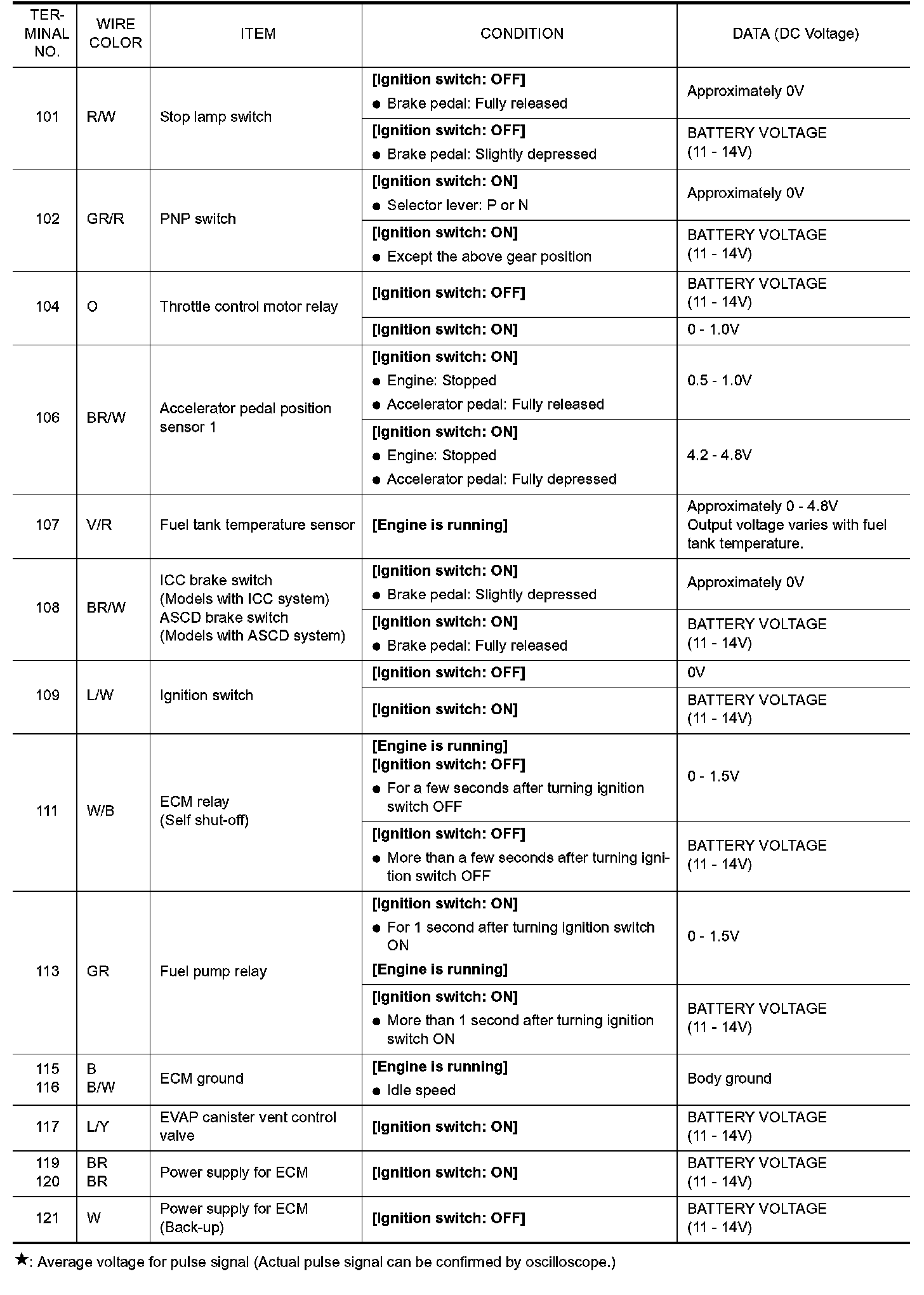 Specification data are reference values and are measured between each terminal and ground. Pulse signal is measured by CONSULT-II.
