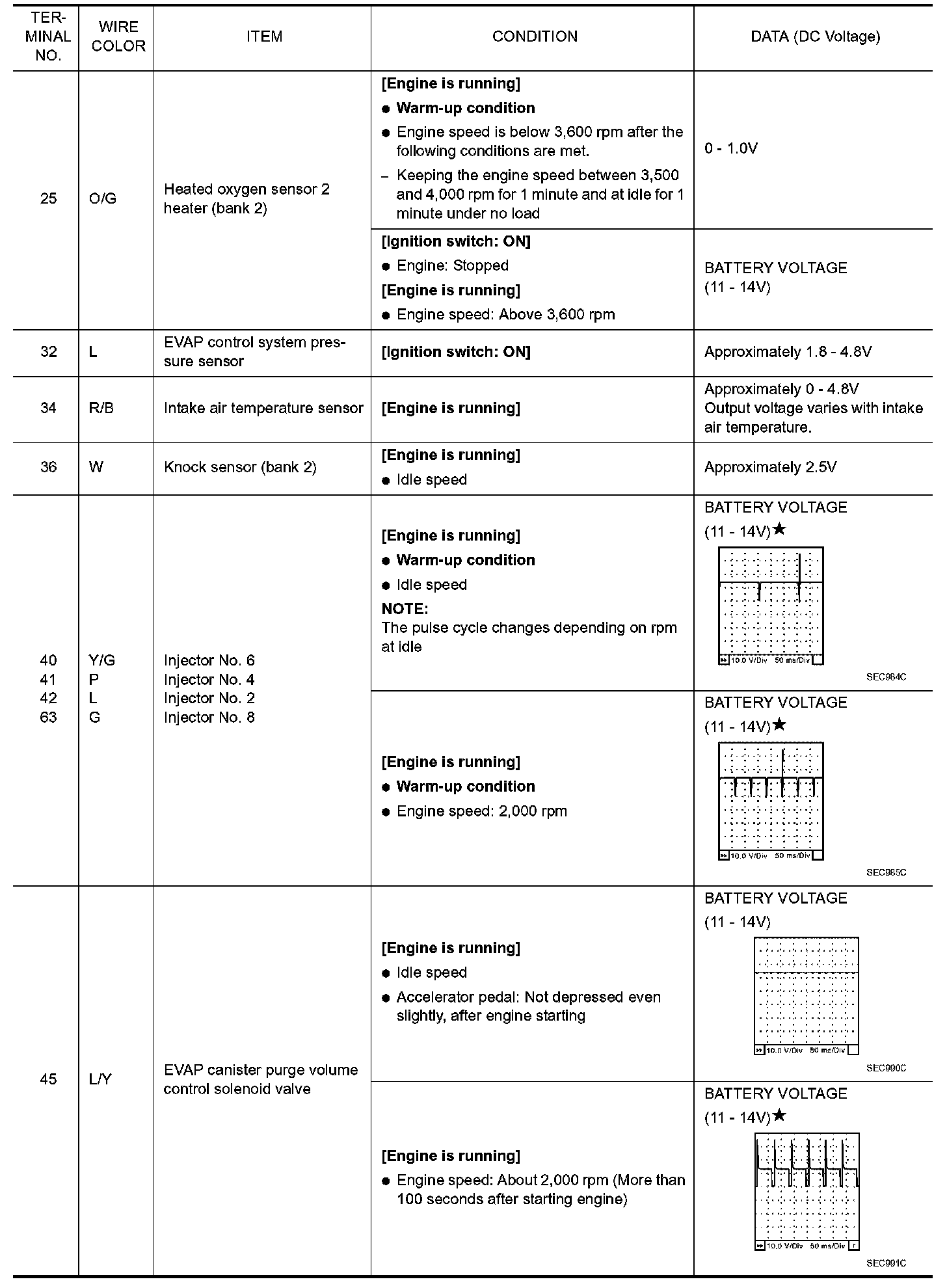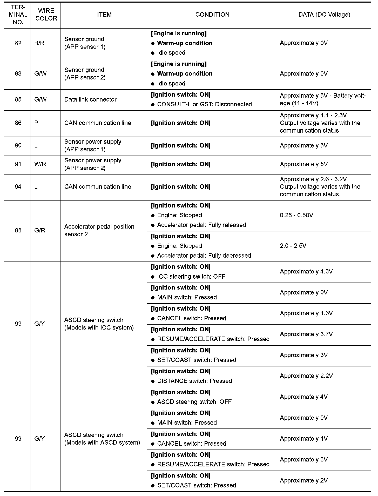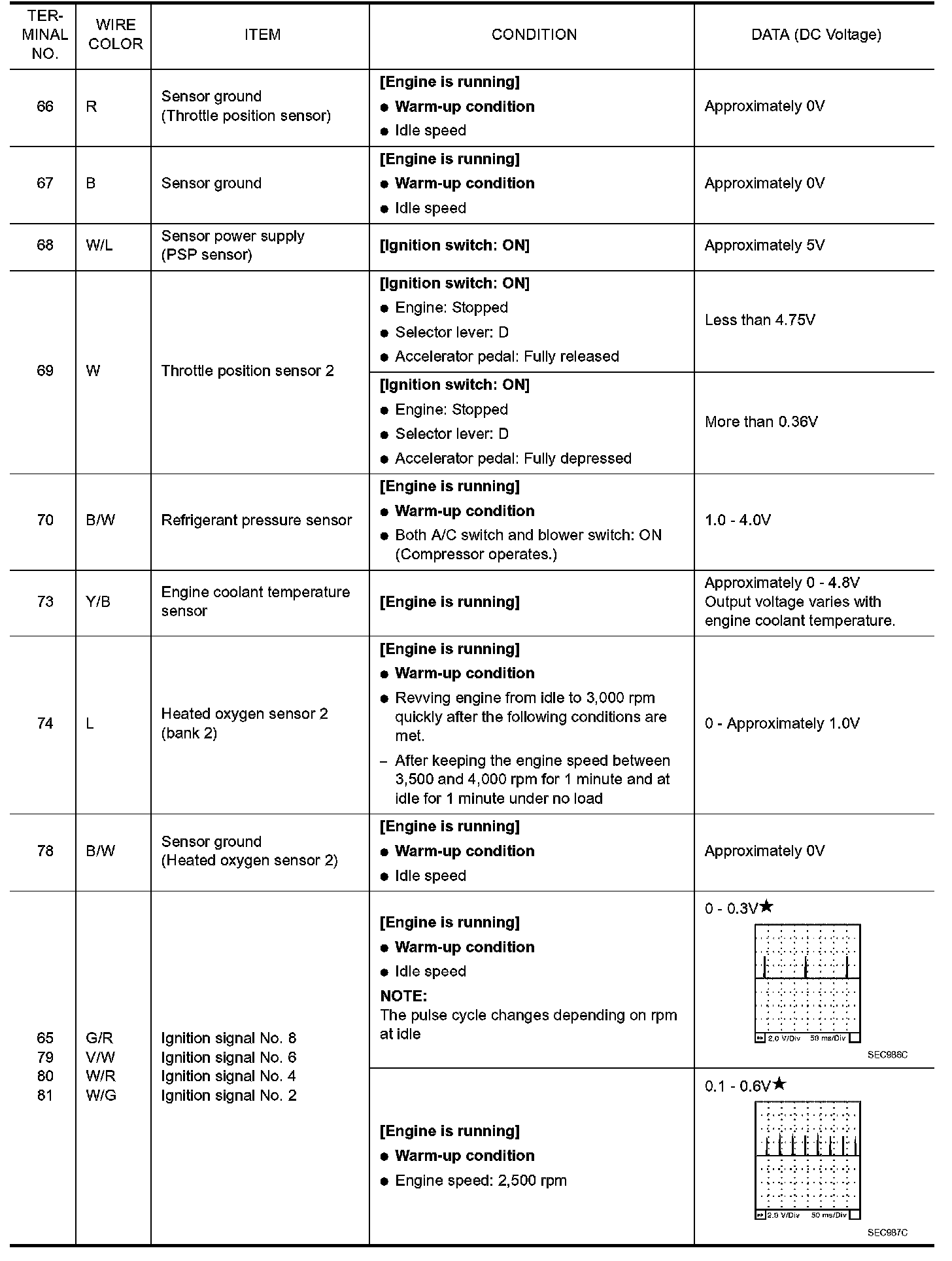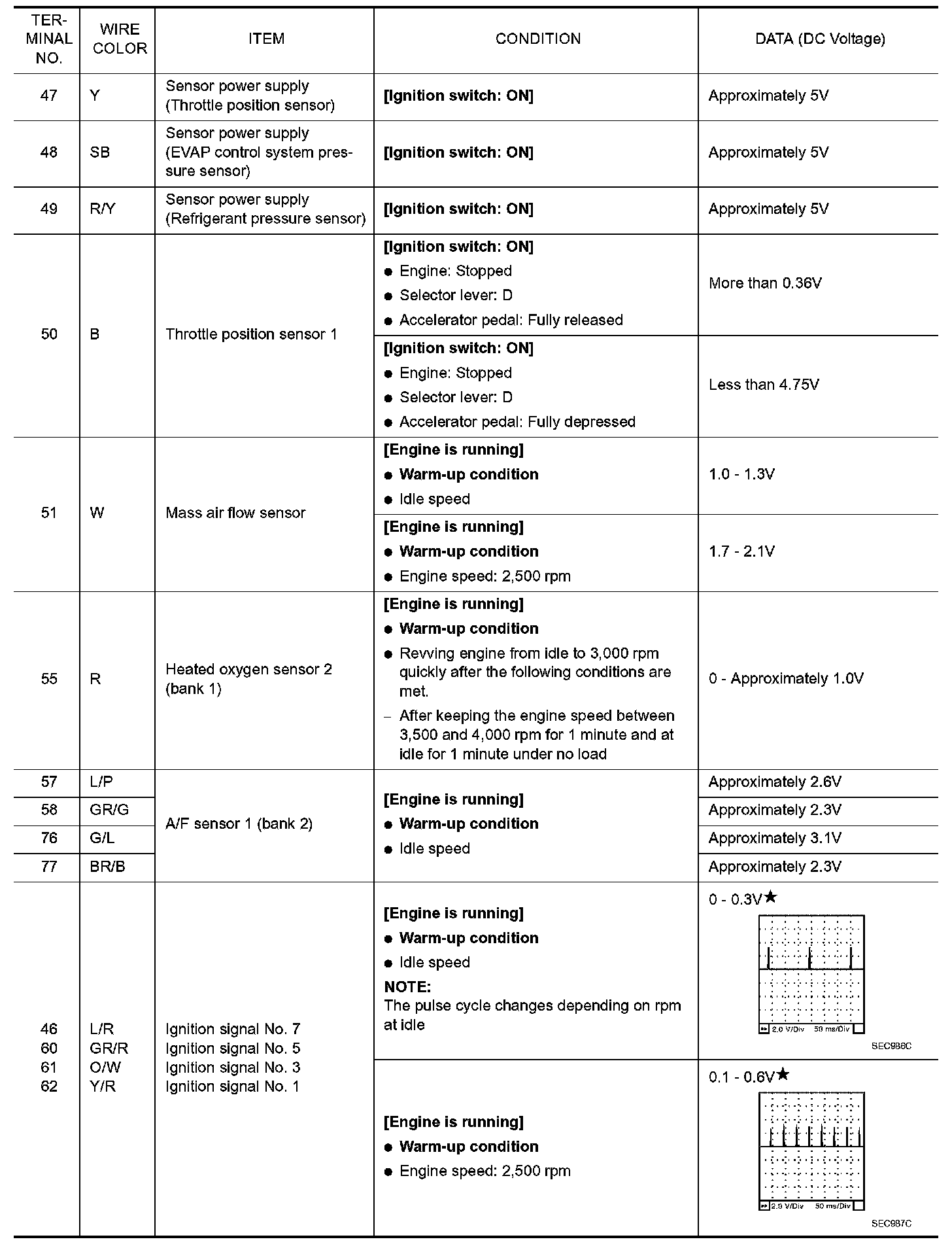 Specification data are reference values and are measured between each terminal and ground. Pulse signal is measured by CONSULT-II.